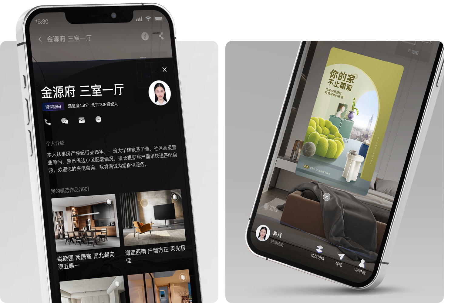 轻松打造专业级展示· VR展示经纪人电话、微信二维码等· 24小时在线获客