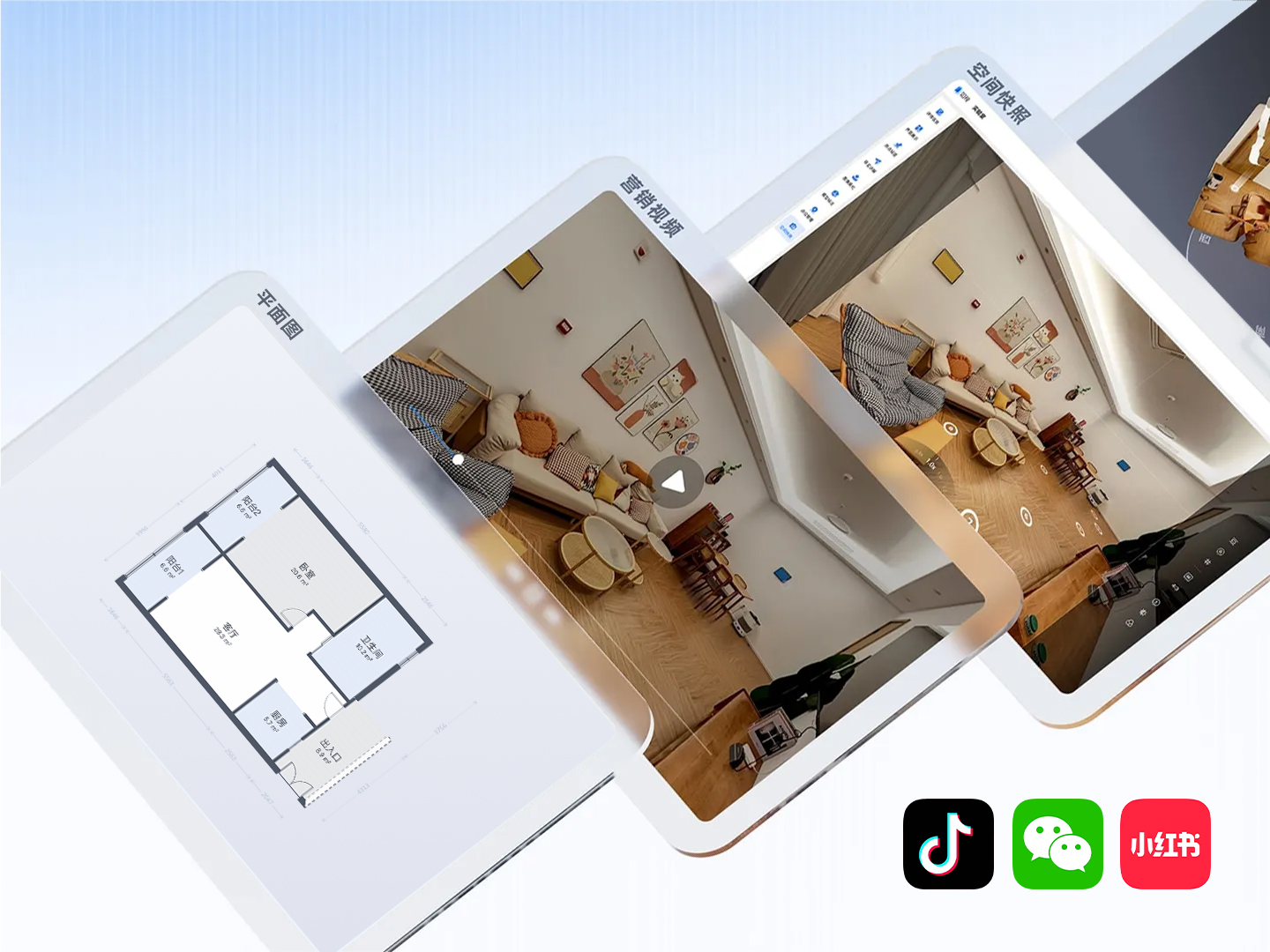一次拍摄,超多素材· 自动生成 VR 漫游链接· 输出全景图 / 高清图片· 一键生成 VR 剪辑视频· 可用于公众号 / 抖音 / 小红书 / 私域 / 官网等